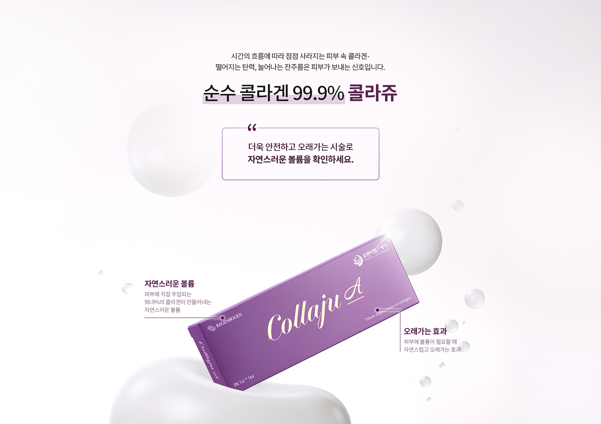 자연스러운 볼륨피부에 직접 주입되는 99.9%의 콜라겐이 만들어내는 자연스러운 볼륨