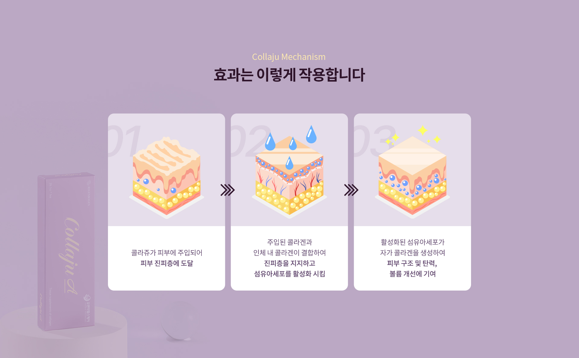주입된 콜라겐과 인체 내 콜라겐이 결합하여 진피층을 지지하고 섬유아세포를 활성화 시킴