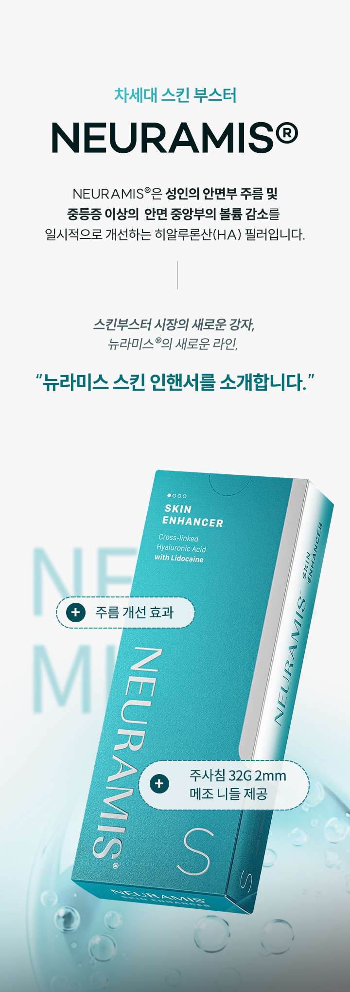 NEURAMIS은 성인의 안면부 주름 및 중등증 이상의 안면 중앙부의 볼륨 감소를 일시적으로 개선하는 히알루론산(HA) 필러입니다.